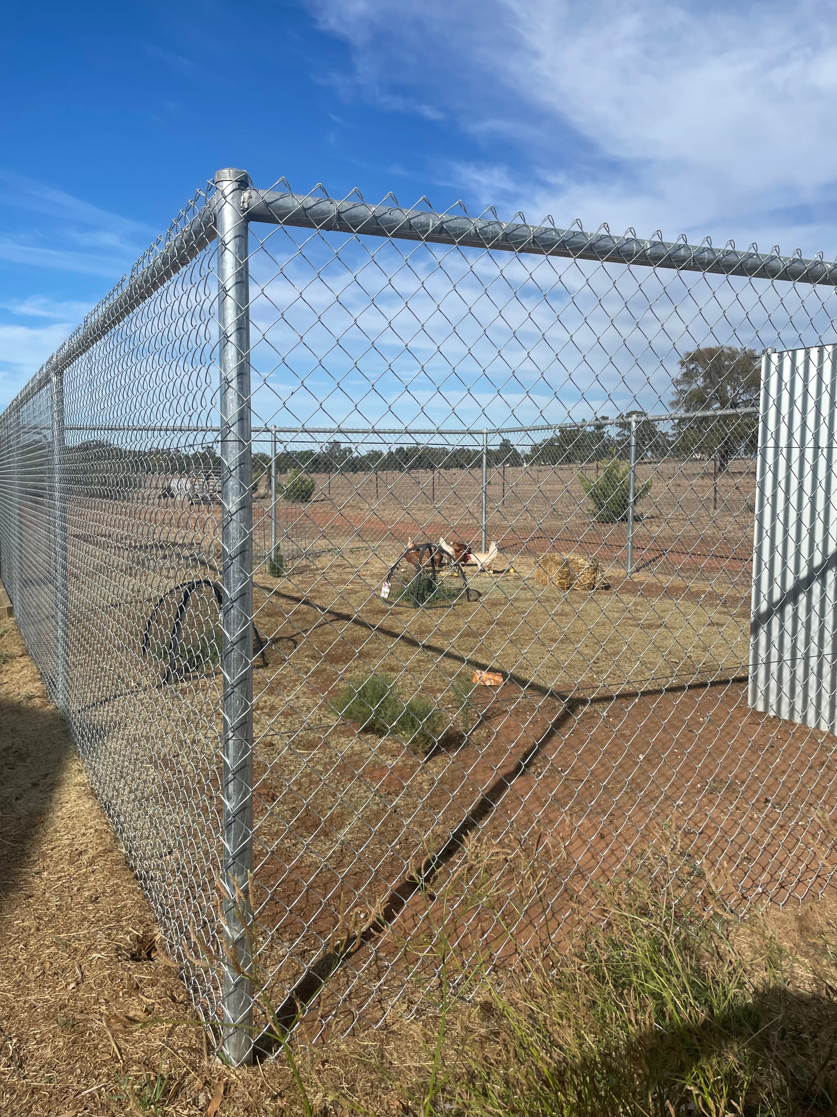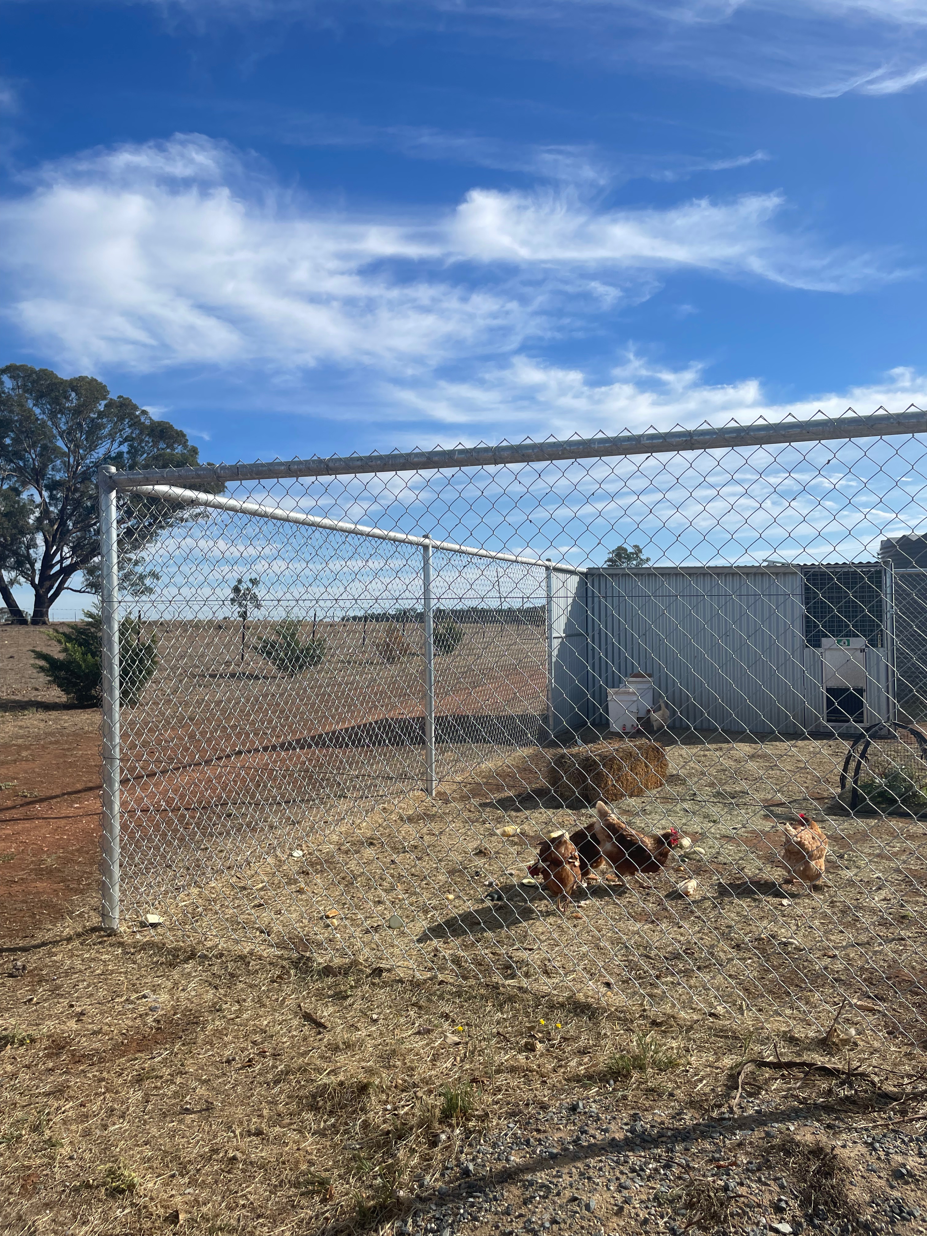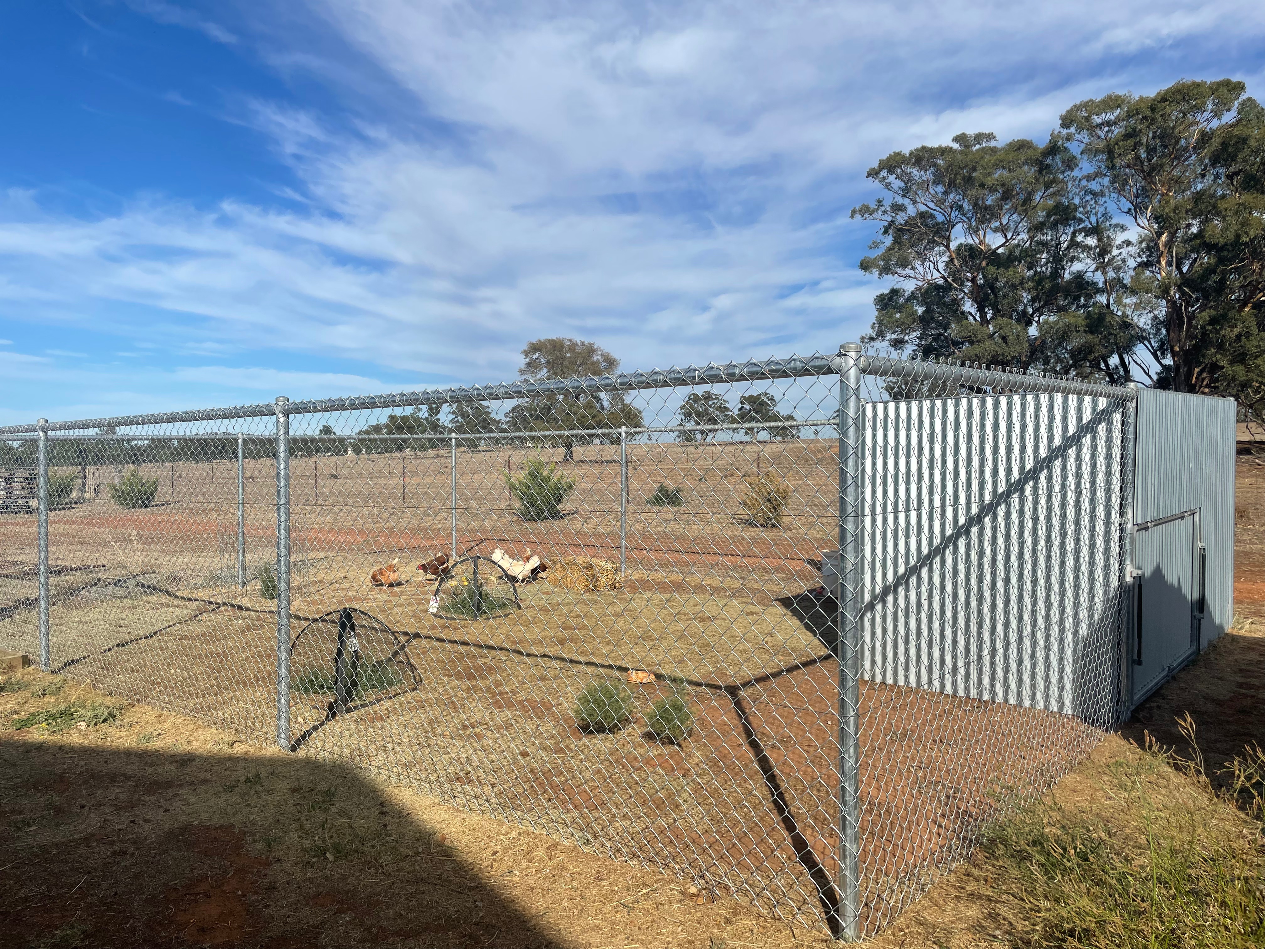 A recently completed Chicken Coop with mm Gal posts driven in m deep, welded top rail, chainlink with three plain wire …and a corrugated iron coop with Auto door installed.